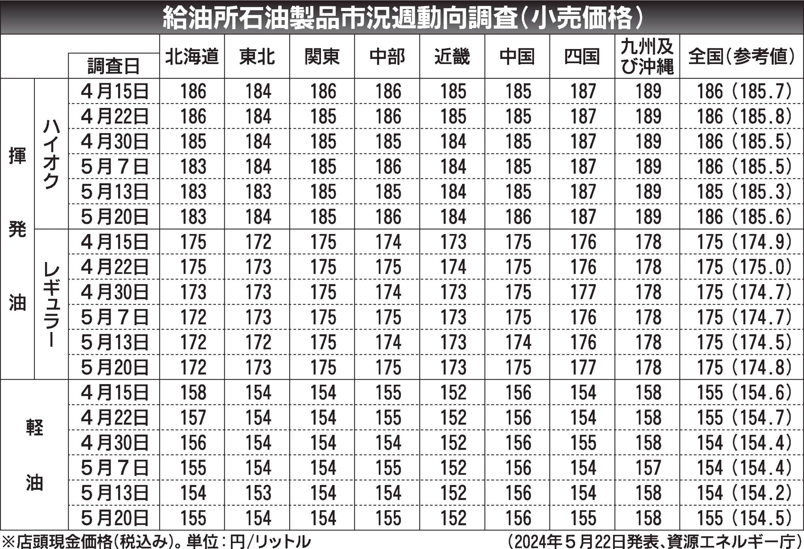〈給油所石油製品市況週動向調査(小売価格)〉2024/4/15~5/20