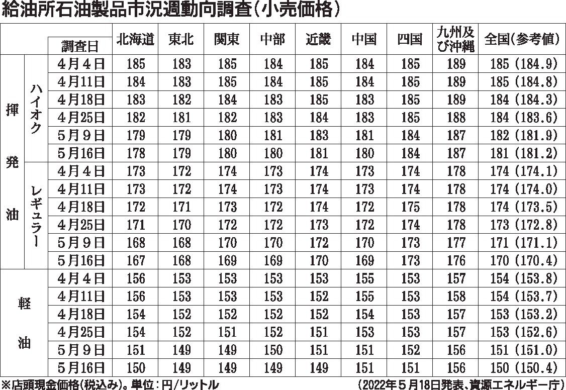 〈給油所石油製品市況週動向調査(小売価格)〉2022/4/4~5/16