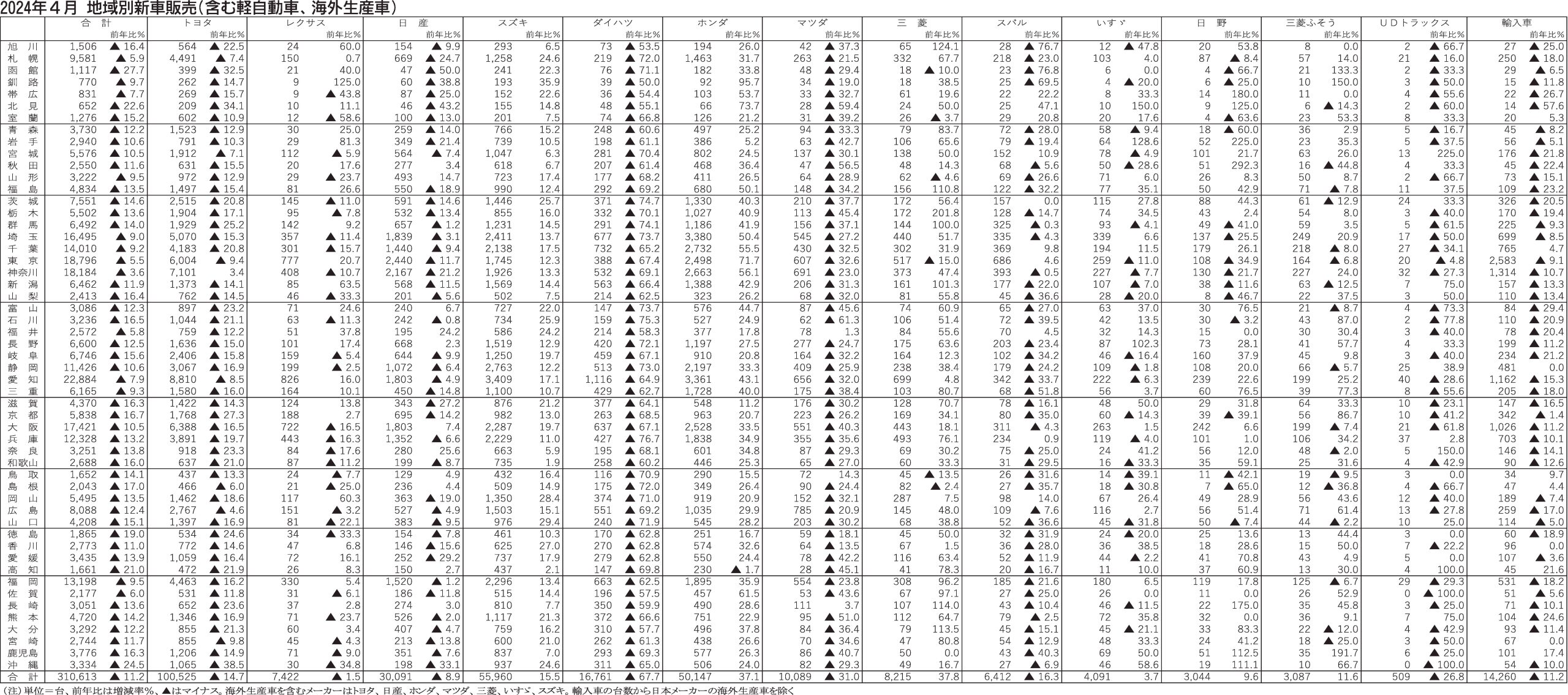 〈2024年4月 地域別新車販売(含む軽自動車、海外生産車)〉