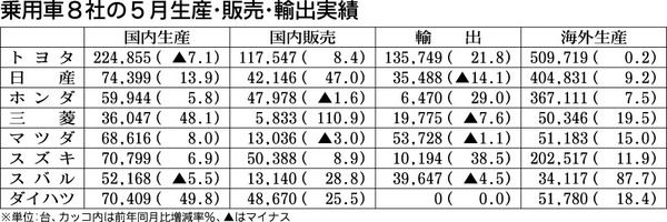 乗用車メーカー8社、5月の生産・輸出実績