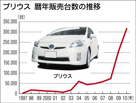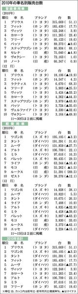 日本自動車販売協会連合会(自販連、天野洋一会長)と全国軽自動車協会連合会(全軽自協、小谷忠幸会長)は11日、2010年暦年の乗用車ブランド通称名別順位を発表した。1位は前年比51・1%増の31万5669台でトヨタ自動車の「プリウス」(EX...