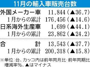 日本自動車輸入組合(JAIA、ハンス・テンペル理事長)が4日発表した2008年11月の輸入車新規登録台数は、前年同月比37・7%減の1万3543台で7カ月連続の前年割れとなった。11月実績としては1988年以来の低水準で、93年以来の2万...