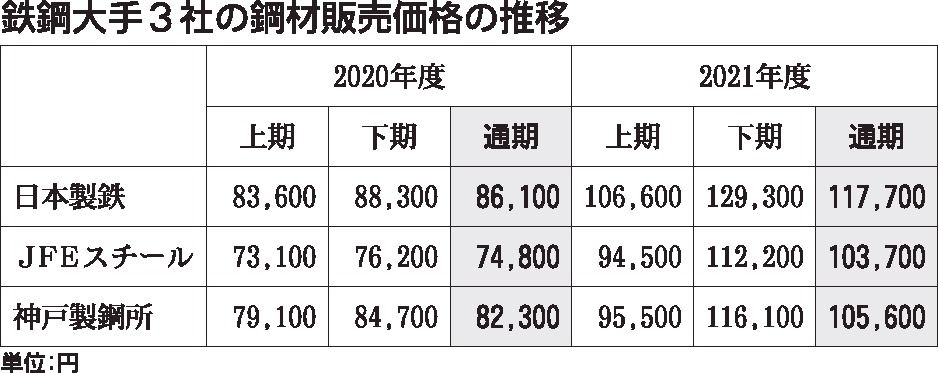 鉄鋼大手3社、鋼材販売価格の改善進む 2021年度は平均10万円超