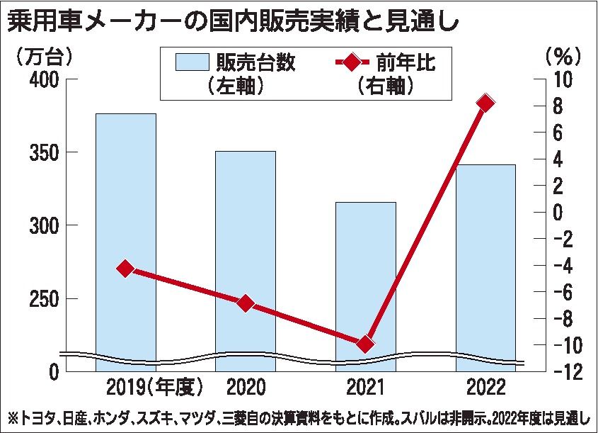 2023年3月期の国内市場は、前期と比べて大幅に回復する見通しだ。トヨタ自動車や日産自動車など通期の国内販売計画を公表した乗用車メーカー6社の合計は前期比8・2%増の341万5千台となった。全社が前期を上回る計画を立てており、うち4社は新...