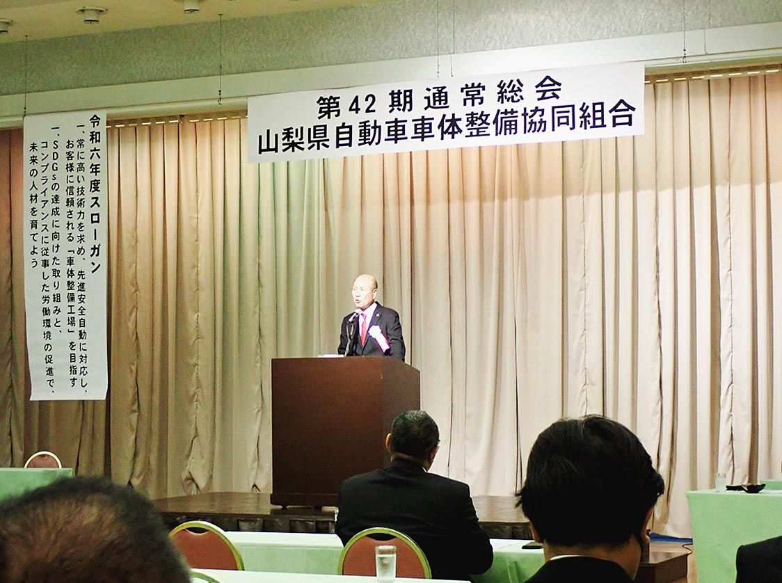 【甲府】山梨県自動車車体整備協同組合(市川清理事長)は、昭和町の式場で「第42期通常総会」を開催した。提出議案は全て承認、可決し、2024年度スローガン「常に高い技術力を求め、先進安全自動車に対応し、お客さまに信頼される『車体整備工場』を...