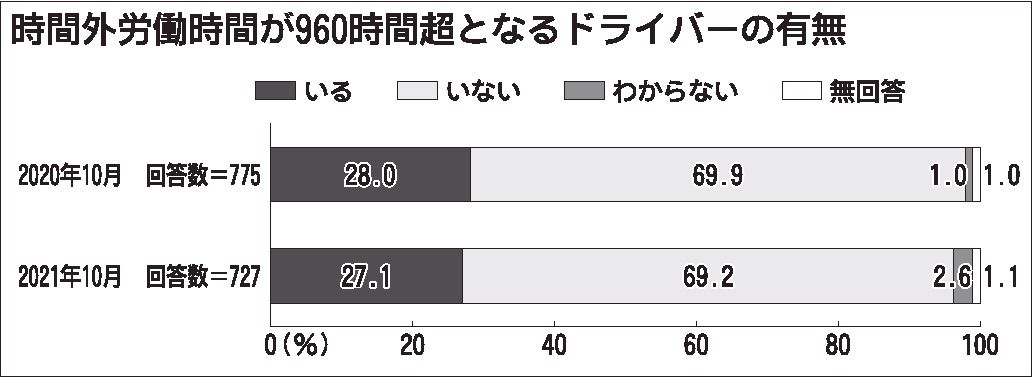 全日本トラック協会(全ト協、坂本克己会長)は、トラック運送事業者の働き方改革の進捗に関するモニタリング調査の結果を発表した。それによると、時間外労働時間(法定休日労働を含まず)が960時間を超えるドライバーがいる事業者の割合が、前回調査比0.9ポイント減の27.1%となり、若干の改善がみられた。しかし、依然として3割近くを占めており、全ト協が目標とする2024年度までの「960時間超ゼロ」の達成には、さらなる取り組みが必要な状況だ。