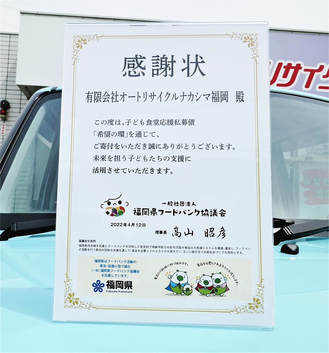 【福岡】オートリサイクルナカシマ福岡(中島邦晃社長、福岡県筑紫野市)は、SDGs(持続可能な開発目標)取り組みの一環として、「子ども食堂応援私募債『希望の環』」を通じ、福岡県フードバンク協議会に寄付した。浄財は西日本シティ銀行の協力で私募...