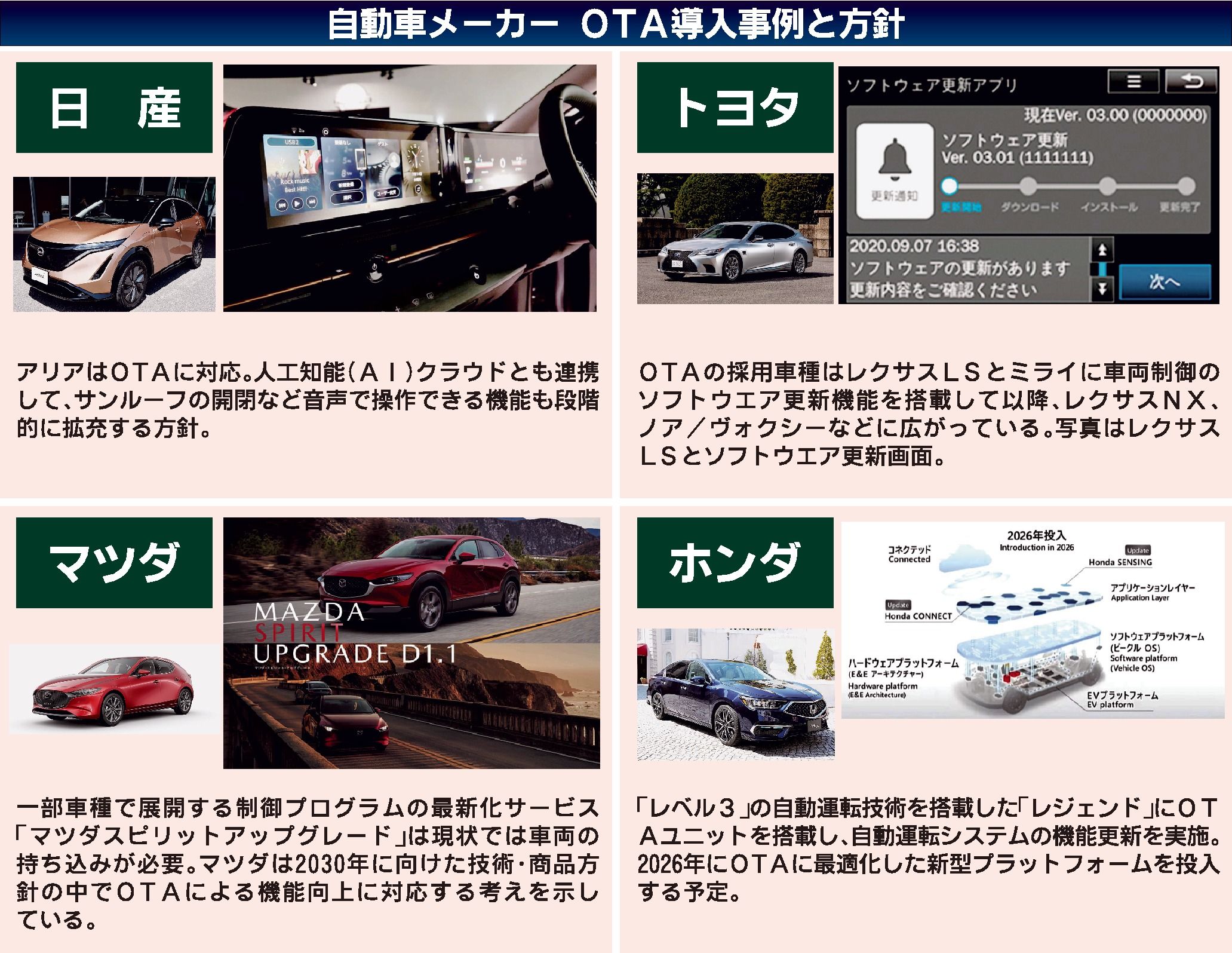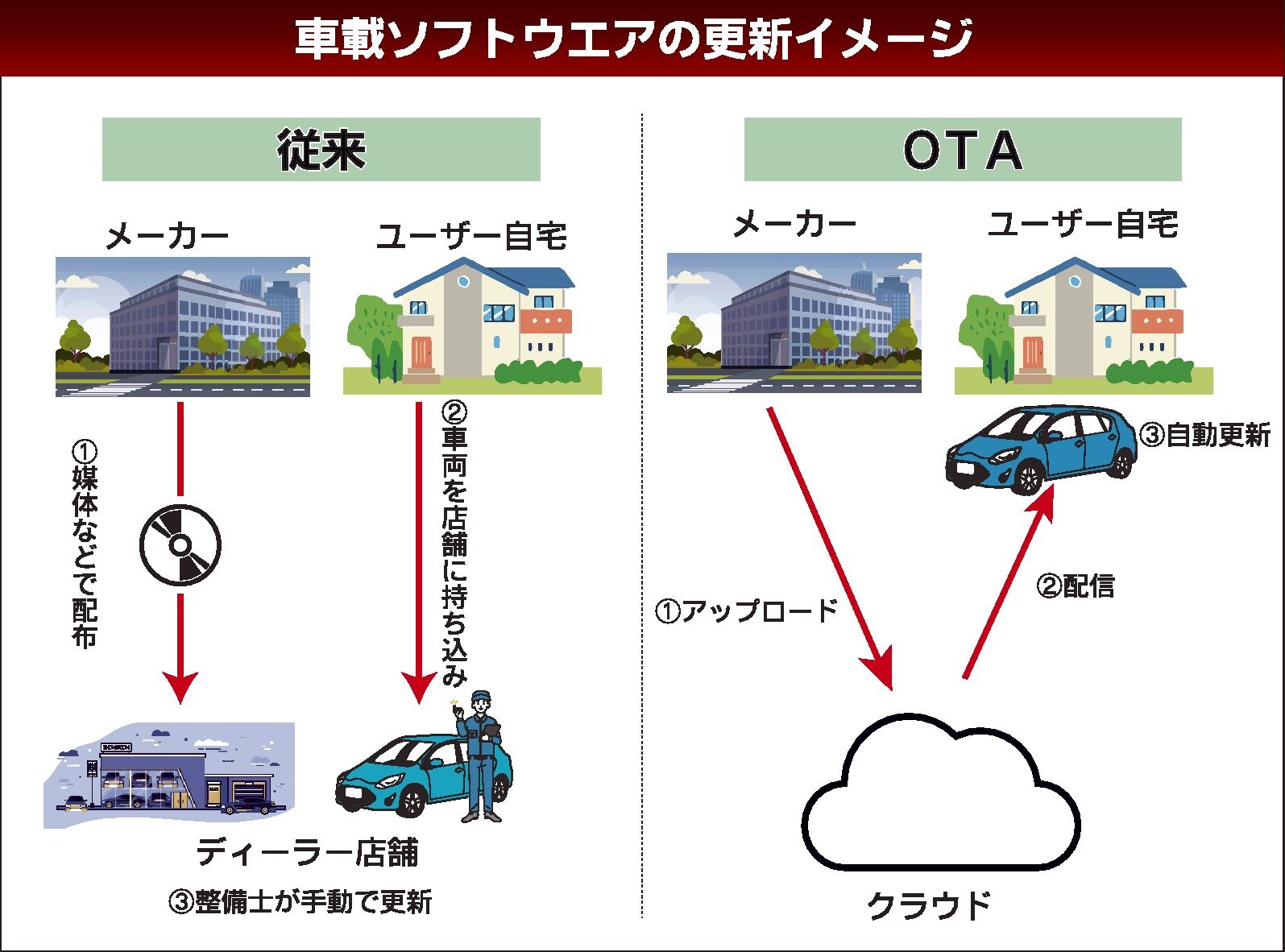 無線通信で車載ソフトウエアをアップデートするOTA(オーバー・ジ・エア)に対応する車両が増えてきた。最新の地図データの更新や運転支援機能の追加などを、ディーラーに車両を持ち込まずに行える。OTAは米電気自動車(EV)メーカーのテスラが先行...