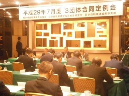 【熊本】熊本県自動車販売店協会(與縄義昭会長)と日本自動車査定協会熊本県支所(同支所長)、日本自動車連盟(JAF)熊本支部(梅﨑輝也支部長)は7日、熊本市内のホテルで「平成29年7月度3団体合同定例会」を開催した。例会では各団体が年度や上...