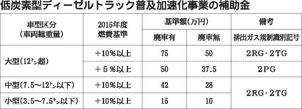補助要件は、新車で22年4月1日から23年1月31日までに新規登録された車両で、15年度重量車燃費基準を大型車は「+5%以上」、小型・中型車は「+10%以上」達成したものとなる。申請台数は1事業者2台まで(リースの場合は貸渡先事業者となる)。