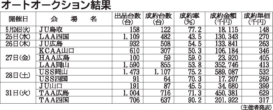 〈オートオークション結果〉中四国地区 2022/5/24~31