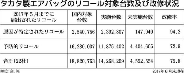 国土交通省は21日、タカタ製エアバッグ用インフレーター(膨張装置)の改修進ちょく状況を公表した。6月末で全体の75・8%に当たる約1426万8千台で改修を済ませた。改修率は前月末より2・3ポイント上昇した。...