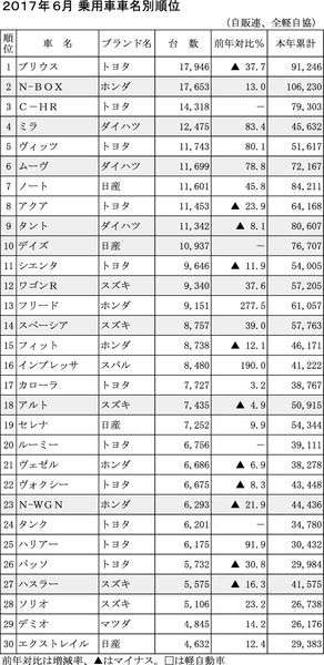 17年6月の乗用車車名別順位は、ベスト10のうち登録車と軽自動車が同数だった。首位はトヨタ「プリウス」で、前年同月に比べ4割近いマイナスとなったものの,トップの座を維持した。登録車では全体で5位のトヨタ「ヴィッツ」は8割増、7位の日産「ノ...