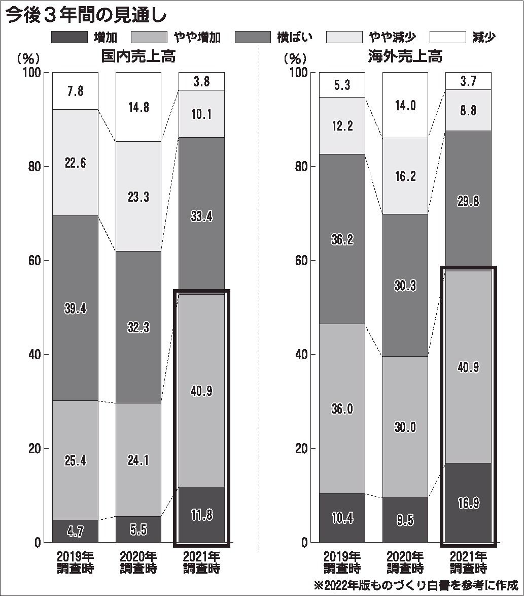 コロナ禍からの本格的な景気回復に期待する声が高まっている。経済産業省が公表した「2022年版ものづくり白書」によると、今後3年間で国内における自社の売上高が増加する見通しとした製造事業者数が前年調査の1・7倍となった。一方、コロナ禍でサプ...