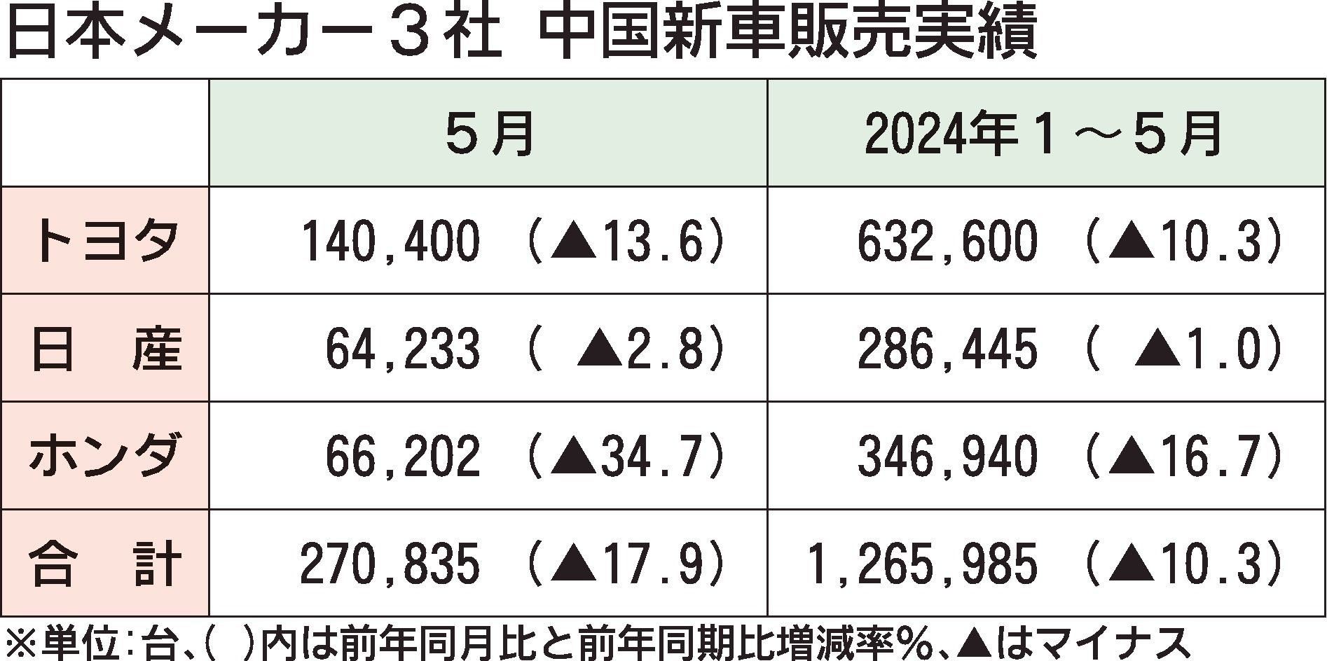 日本メーカー3社による5月の中国販売は前年同月比17.9%減の27万835台だった。前年実績を4カ月連続で下回った。現地では電気自動車(EV)など新エネルギー車(NEV)の値下げ競争が続く。中国政府は4月下旬、NEVへの買い替え補助金の支...
