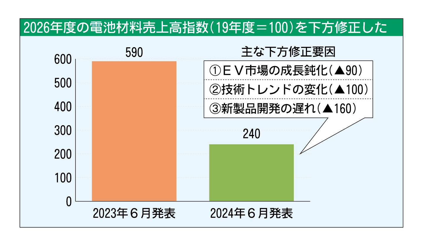 欧米でのEV市場の成長率が想定よりも鈍化していることや、新製品の開発が計画よりも遅れている。さらに、同社が取り扱っていない正極材料にリン・鉄・リチウムを使用する低価格で安全性の高いリン酸鉄リチウムイオン(LFP)電池のシェアが拡大している。このため、26年度の電池材料事業の売り上げ目標を当初目標から約6割引き下げて19年度比2.4倍に下方修正した。