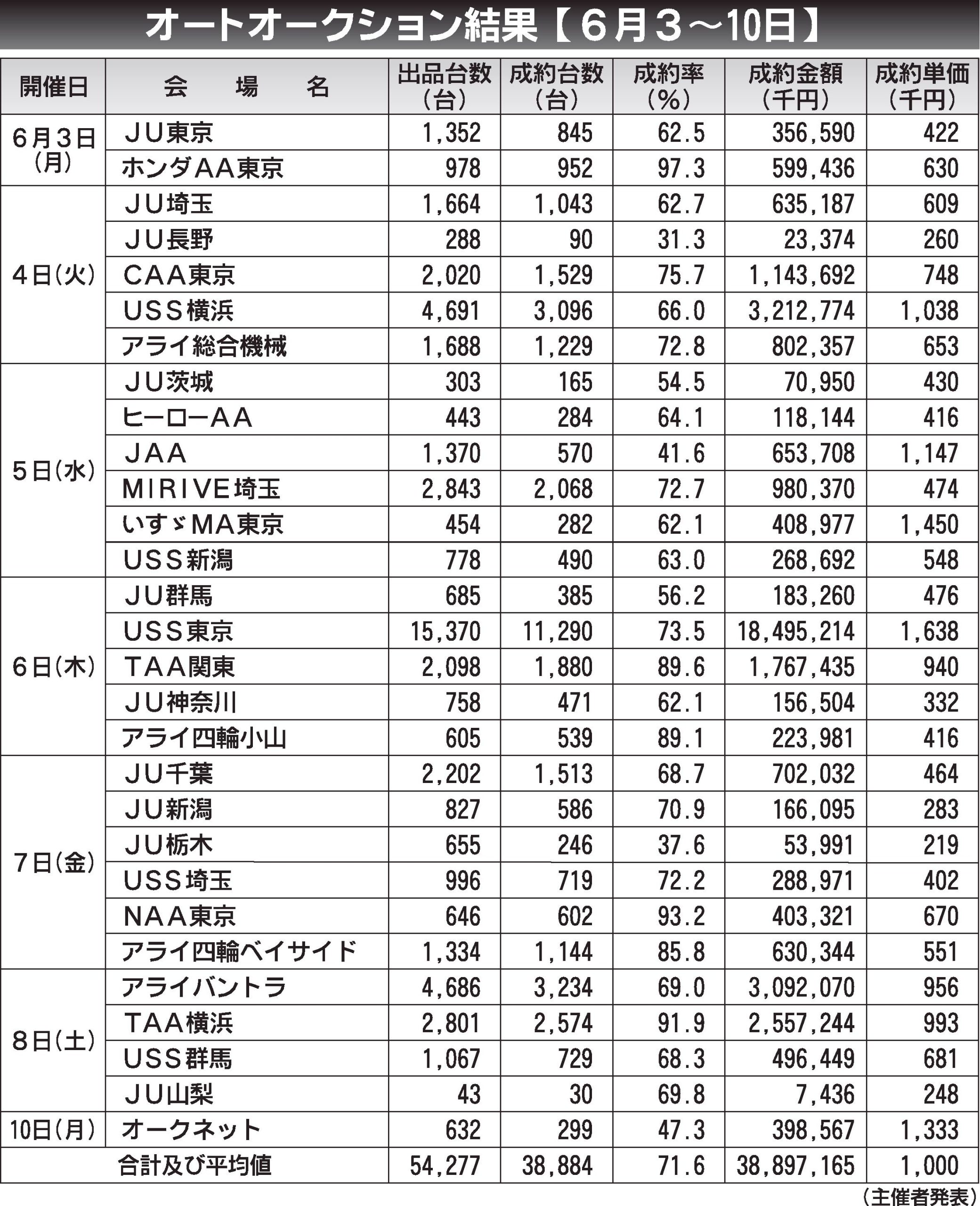 〈オートオークション結果〉首都圏 2024/6/3~10