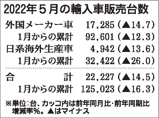 日本自動車輸入組合(JAIA、クリスチャン・ヴィードマン理事長)が6日発表した5月の外国メーカー車新規登録台数は、前年同月比14.7%減の1万7285台だった。前年割れは9カ月連続で、マイナス幅も前月から10.8ポイント拡大した。