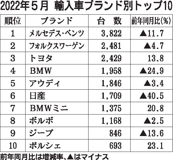 登録車全体に占める外国メーカー車のシェアは10.7%で、5月としては統計開始以来最高だった。外国メーカー車のブランド別ではメルセデス・ベンツが同11.7%減の3822台で首位となった。2位はフォルクスワーゲン(VW)で同4.7%減の2481台、3位はBMWで同24.9%減の1958台と、上位勢の落ち込みが響いた。ポルシェ、フェラーリ、ベントレー、スカニアの4ブランドが5月としての最多台数を更新した。