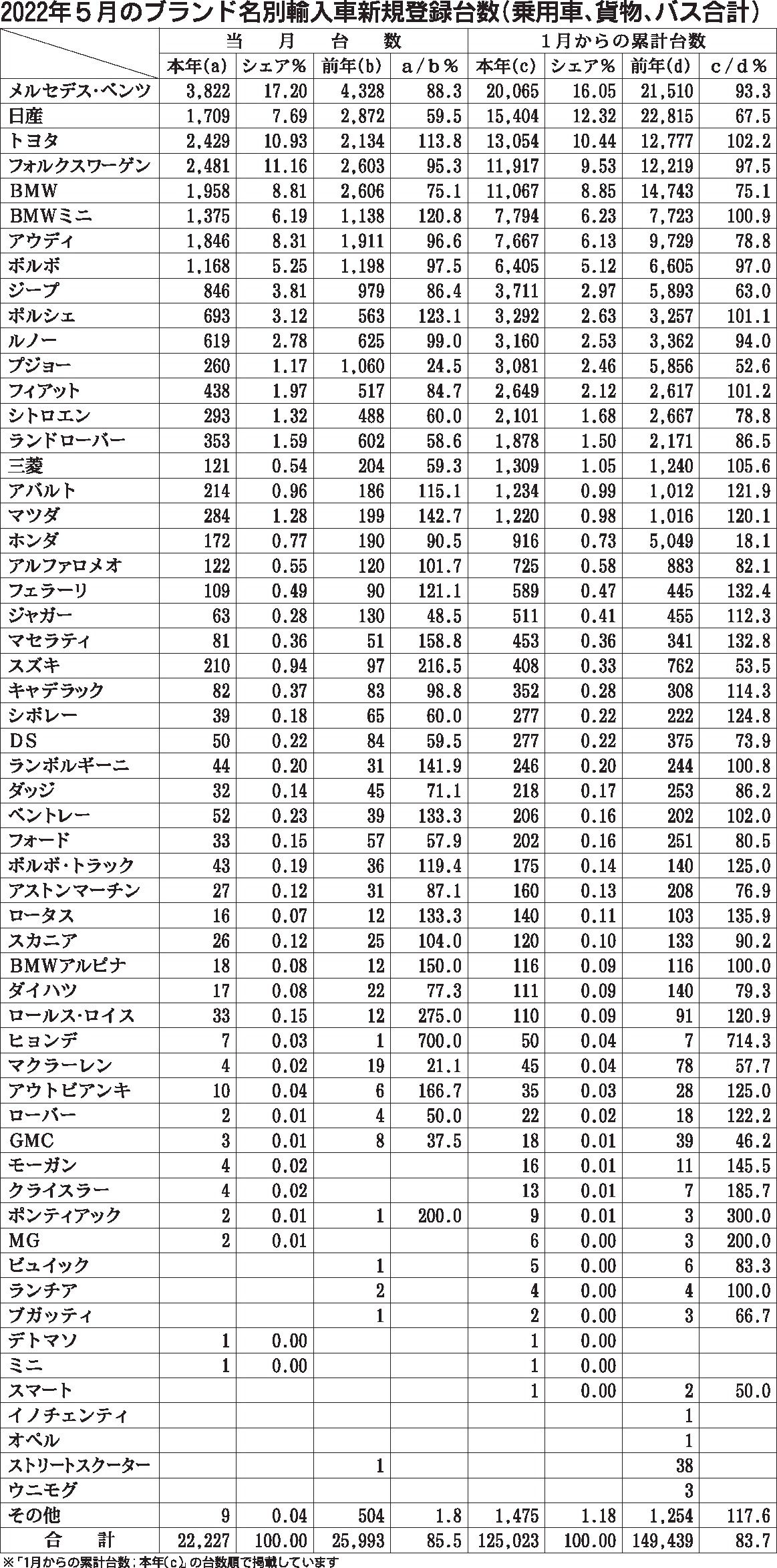〈2022年5月のブランド名別輸入車新規登録台数(乗用車、貨物、バス合計)〉