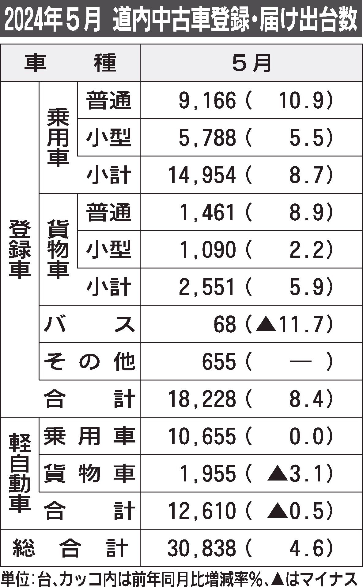 5月の道内中古車登録・届け出台数は、前年同月比4.6%増の3万838台だった。登録車は、バス以外の車種で前年同月を超えた一方、軽自動車が微減だった。 日本自動車販売協会連合会の中古車登録台数と全国軽自動車協会連合会の軽自動車中古車販売台数...