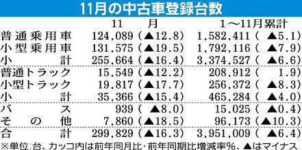 日本自動車販売協会連合会(自販連、天野洋一会長)が10日に発表した2008年11月の中古車登録台数は、前年同月比16・3%減の29万9829台で2カ月連続の減少になった。また、11月単月としては1981年以来27年ぶりの30万台割れになる...