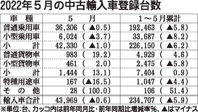 日本自動車輸入組合(JAIA、クリスチャン・ヴィードマン理事長)が10日発表した5月の中古輸入車登録台数は、前年同月比0・6%減の4万3969台だった。貨物車が2カ月ぶりのプラスになったほか、普通乗用車の落ち込みもわずかとなり、全体の前年...