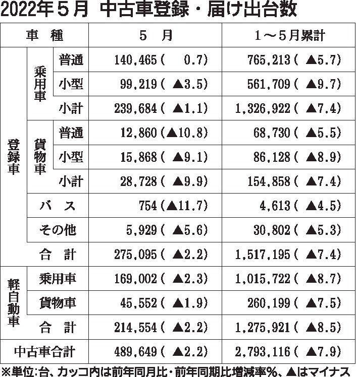 日本自動車販売協会連合会(自販連、金子直幹会長)と全国軽自動車協会連合会(全軽自協、赤間俊一会長)が10日発表した5月の中古車登録・届け出台数は、前年同月比2・2%減の48万9649台となり、12カ月連続で前年割れとなった。ただ、車種別で...