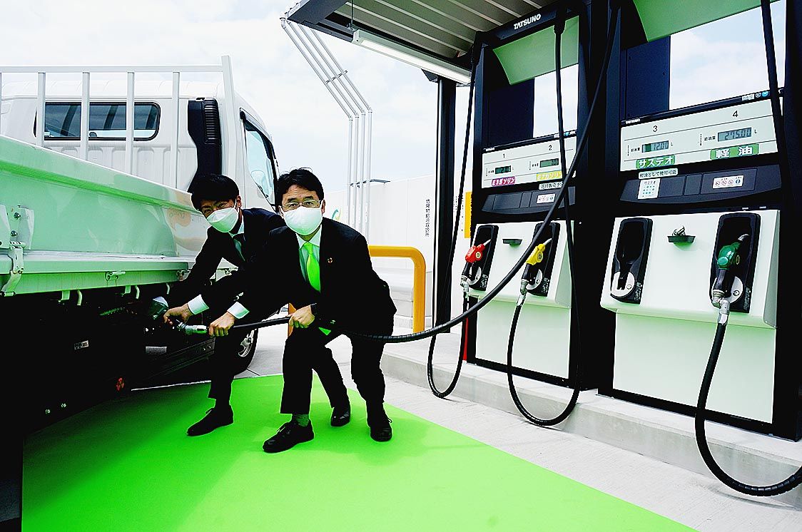 同給油所で行われた式典では、導入第1号としてセントラル・タンクターミナル(宮川靖嘉社長、東京都中央区)の3トントラックに給油が行われた。ユーグレナの出雲充社長は「バイオ燃料20%配合品の販売も、常設店舗での販売も今回が初となる。自動車産業の集積する名古屋の地から、日本のガソリンスタンドとバイオ燃料の新しい歴史が始まる」と述べた。サステオは、使用済み食用油と微細藻類ユーグレナ(ミドリムシ)を原料とするバイオディーゼル燃料。燃焼段階では二酸化炭素(CO2)を排出するが、原料となるユーグレナも使用済み食用油の原材料である植物も、成長過程で光合成によりCO2を吸収する。