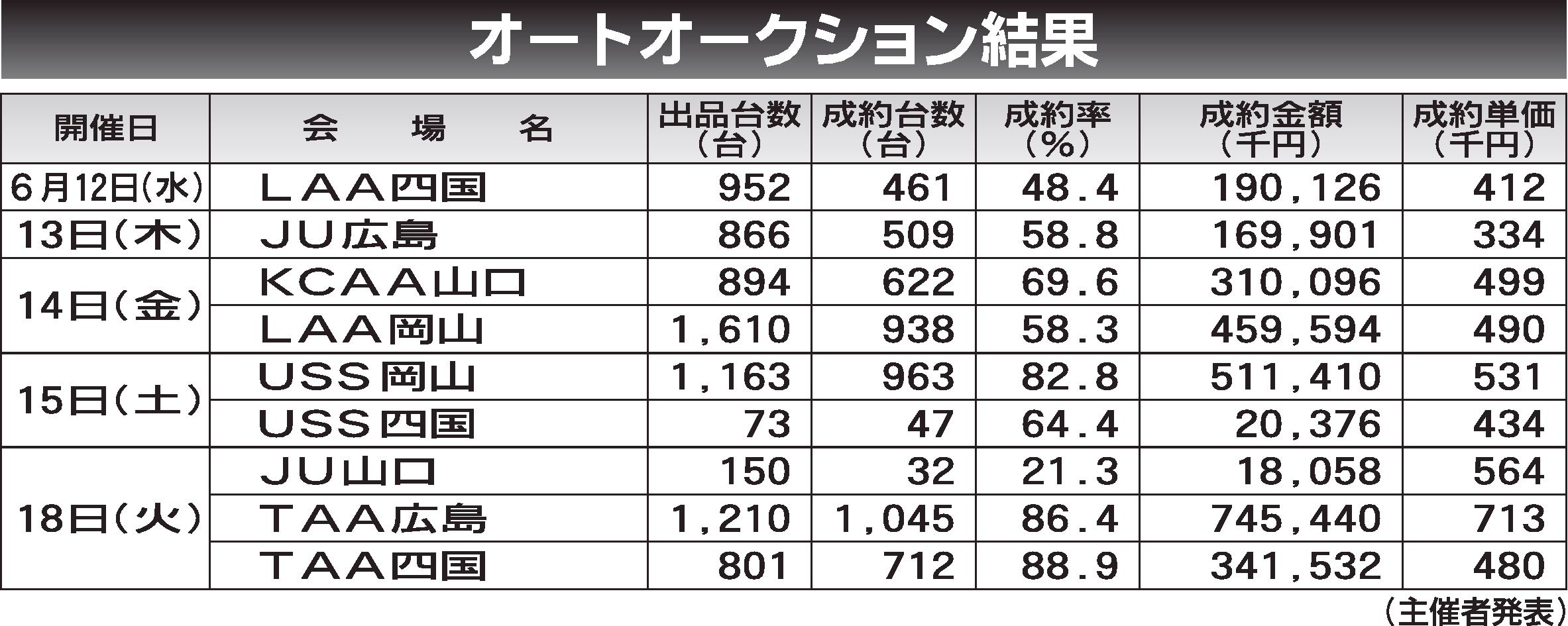 〈オートオークション結果〉中四国地区 2024/6/12~18