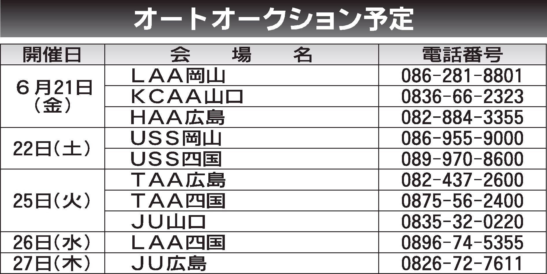 〈オートオークション予定〉中四国地区 2024/6/21~27