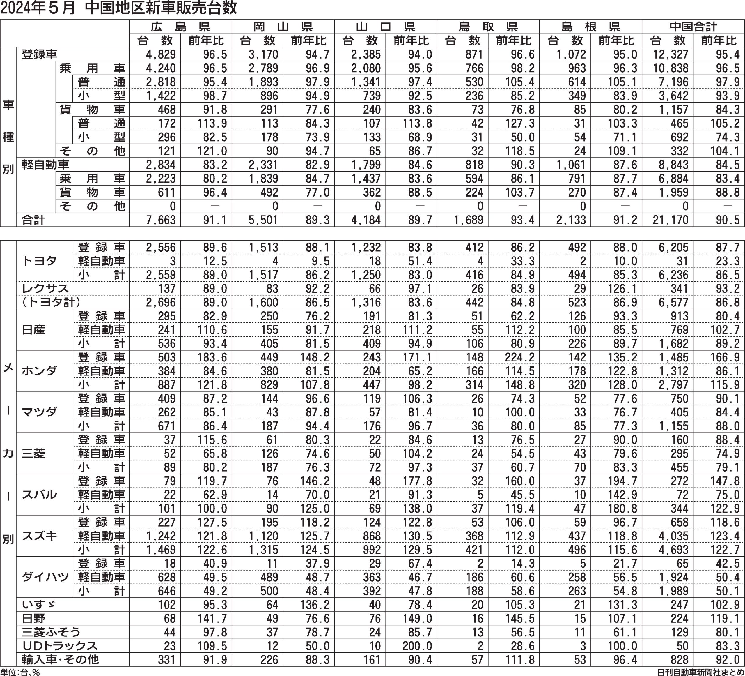 2024年5月の中国地区新車販売台数(登録車と軽自動車の合計)は、前年同月比9.5%減の2万1170台だった。下げ幅は前月から4.3㌽改善したが、5カ月連続で前年台数を下回り、全国平均に対しても5.1㌽低い水準だった。スズキが登録車、軽自...