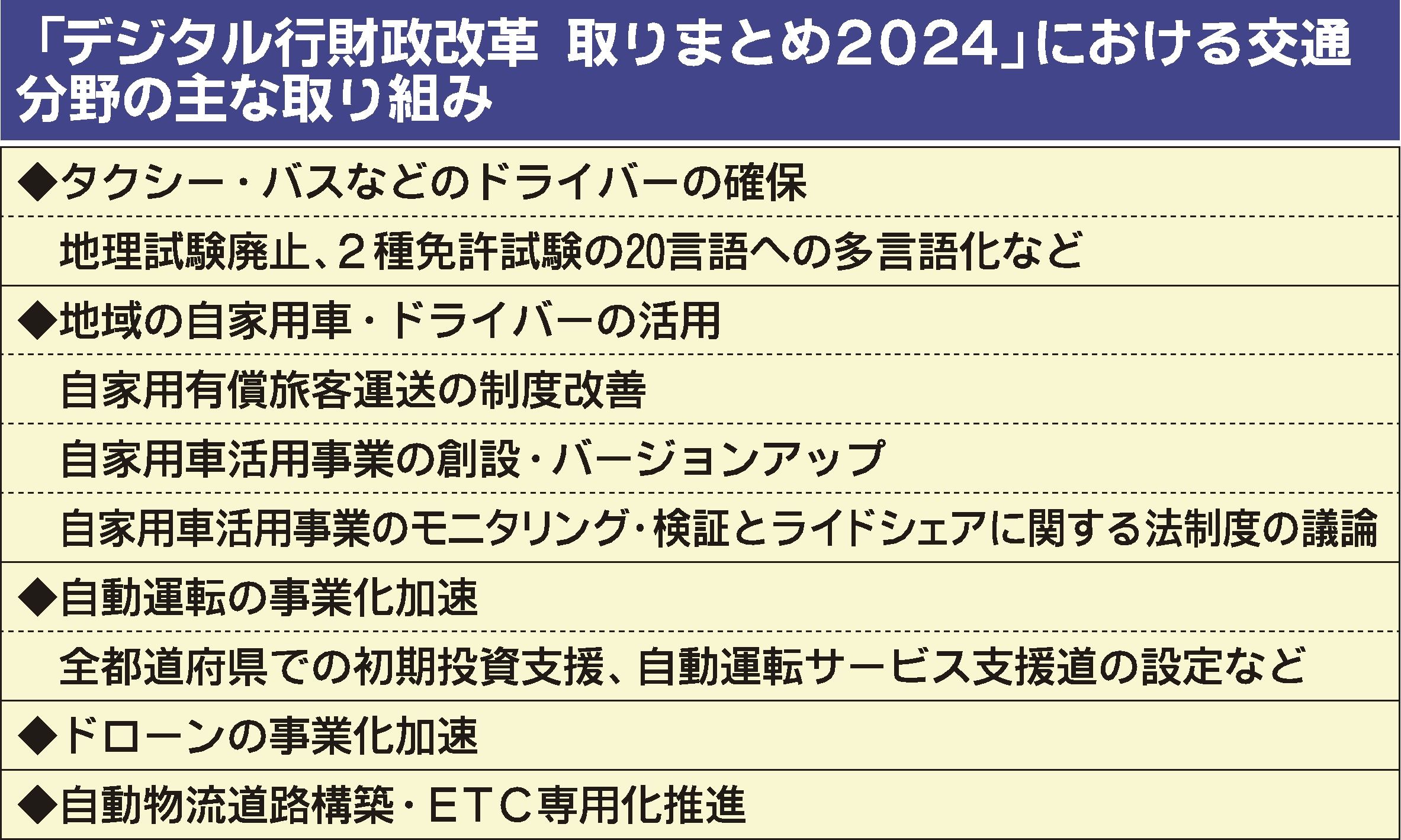 政府は、このほど開いたデジタル行財政改革会議(議長・岸田文雄首相)で、人口減少による各分野の対応策などを盛り込んだ「デジタル行財政改革取りまとめ2024」を決定した。交通分野では、自動運転「レベル4(特定条件下における完全自動運転)」の事...