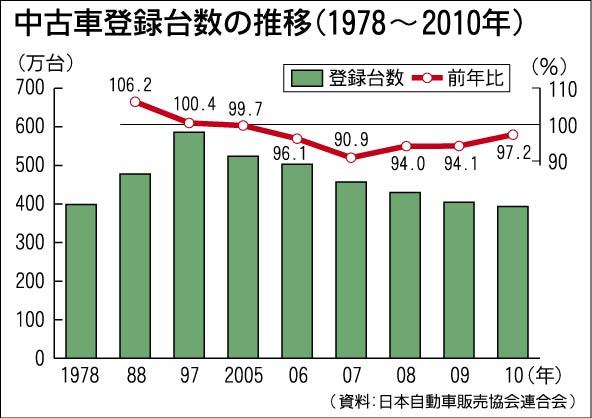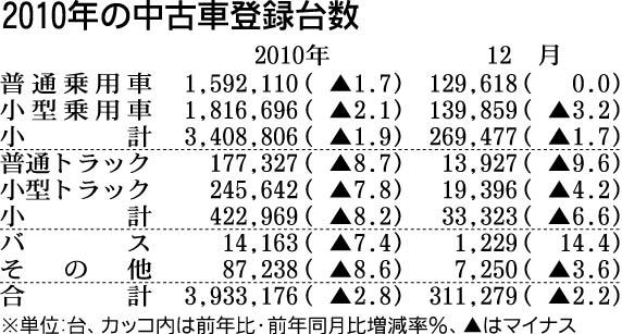2010年暦年の中古車登録台数は400万台を割り込み、32年ぶりの過去最低水準となった。新車販売の低迷から下取り車の発生が減少したことや小売りに適した車両の市場供給量が減少したことが響いた。日本自動車販売協会連合会(自販連、天野洋一会長)...