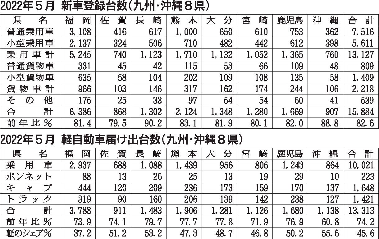 九州・沖縄地区の5月の新車販売台数(登録車と軽自動車合計)は、前年同月比21・5%減の2万9197台で、11ヵ月連続前年割れした。減少率は前月比から9・5㌽拡大した。登録車・軽自動車ともに2桁減と大きな落ち込みとなった。メーカーの生産正常...