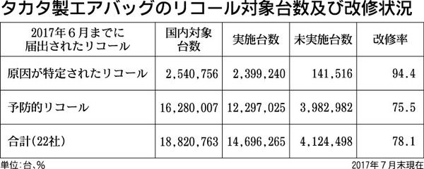 国土交通省は23日、タカタ製エアバッグインフレーター(膨張装置)の改修状況を公表した。7月末時点で改修率は78・1%。前月末と比べ2・3ポイント上昇した。一方、7月以降に1万1508台分のリコール(回収・無償修理)が新たに届けられており、...