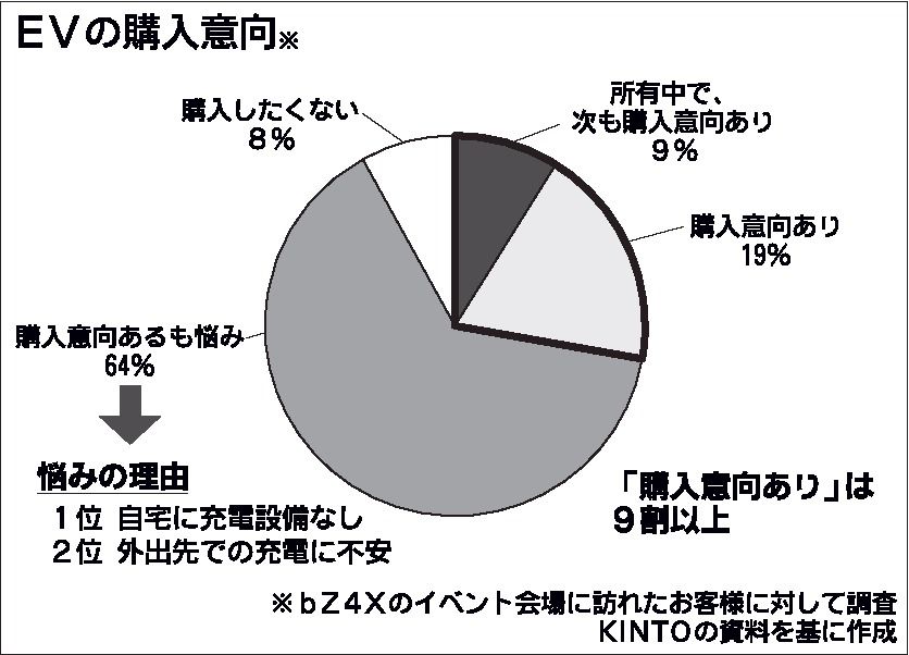 KINTOは、これまでに開催したbZ4Xのイベントで会場を訪れた来場者にEVの購入意向に関するアンケートを実施した。この結果から「購入する意向がある」との回答が9割以上と、ユーザーがEVに高い関心を持っていることが分かった。一方で、6割以上が「購入意向はあるが、悩んでいる」と回答し、理由として「自宅に充電設備がない」「外出先での充電に不安」が上位を占めた。