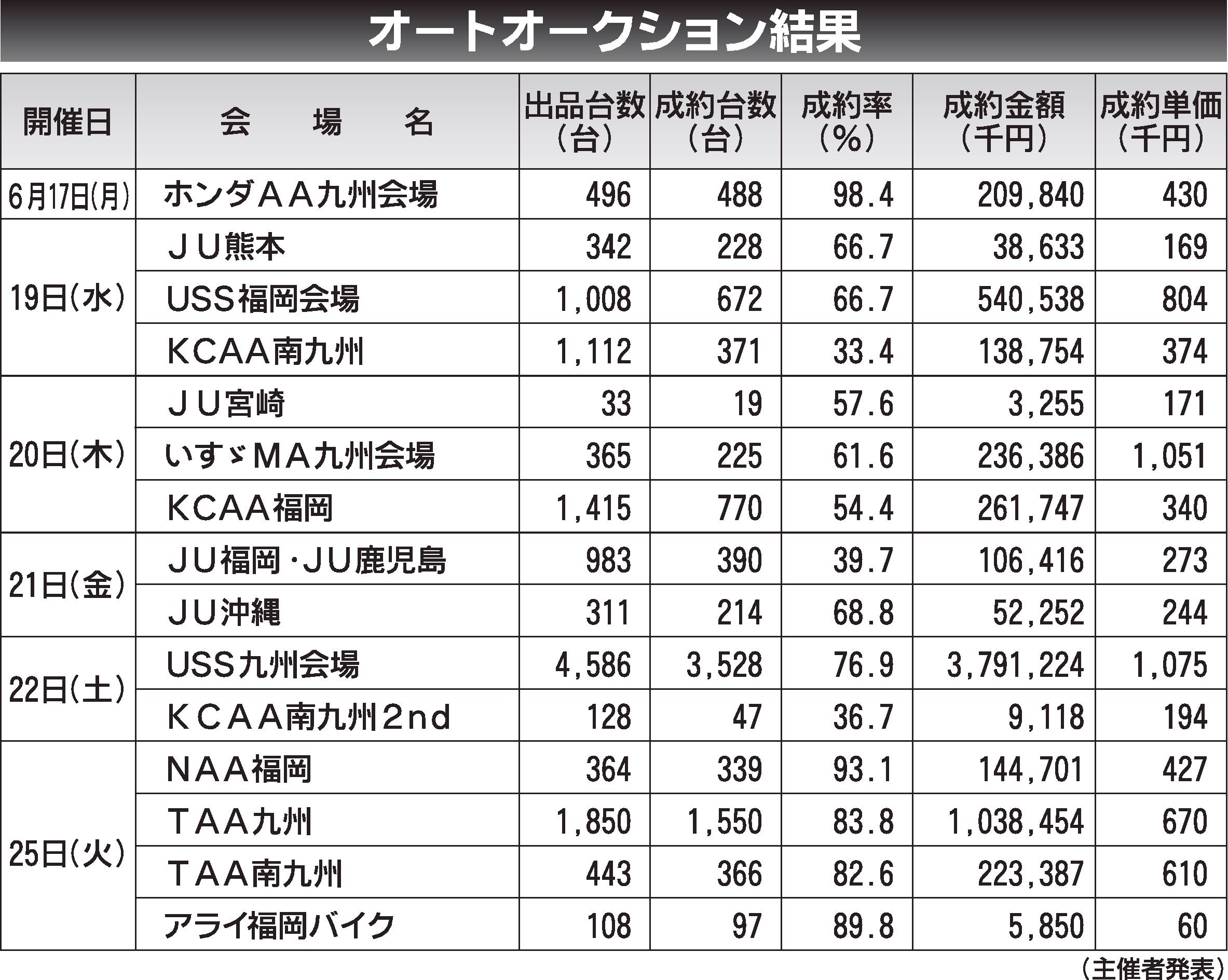 〈オートオークション結果〉九州・沖縄地区 2024/6/17~25