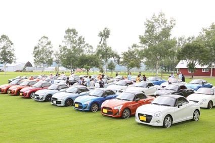 ○…北北海道ダイハツ(森田庸夫社長)はこのほど、顧客との交流を図る一環で「コペンファンミーティング」を開催。45人が参加し、33台で士幌町、鹿追町周辺のツーリングを楽しんだ。写真はゴール地点のレストランにある芝生に30台超のコペンが並んだ...