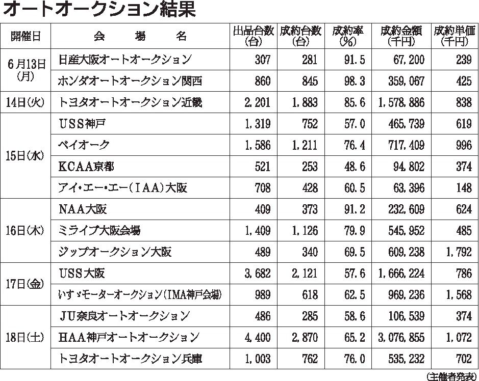 〈オートオークション結果〉近畿地区 2022/6/13~18