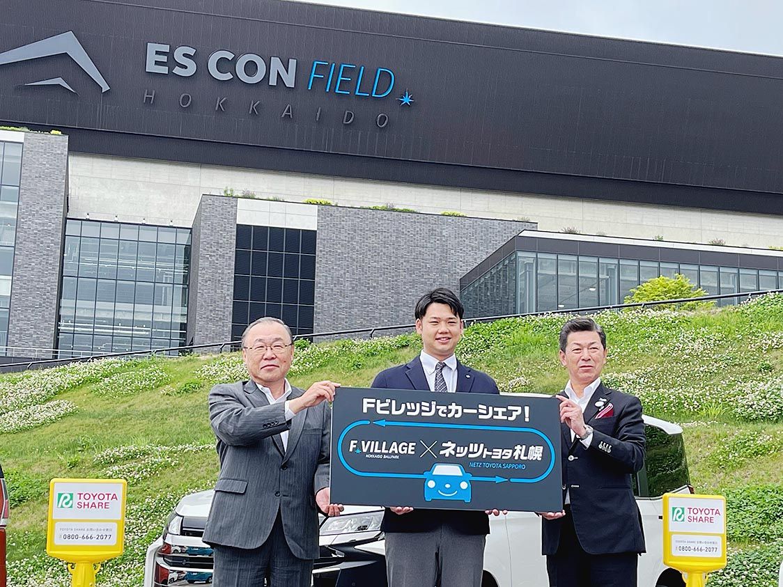 〇…北海道日本ハムファイターズの新球場「エスコンフィールド北海道」のある北広島市Fビレッジ駐車場にネッツトヨタ札幌(鎌田直之社長)のトヨタシェアがオープンした。鎌田社長(写真左)と畠山幹雄常務が元選手で現在球団広報の谷口雄也さんを挟んで行...
