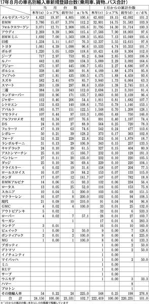 2017年8月の車名別輸入車新規登録台数は、全体が前年同月比2・7%増の2万4156台と堅調だった。メルセデス・ベンツは前年実績並み(同0・4%増)にとどまったものの首位を堅持、これに対し2位のBMWは2桁増(同12・2%増)を記録した。...