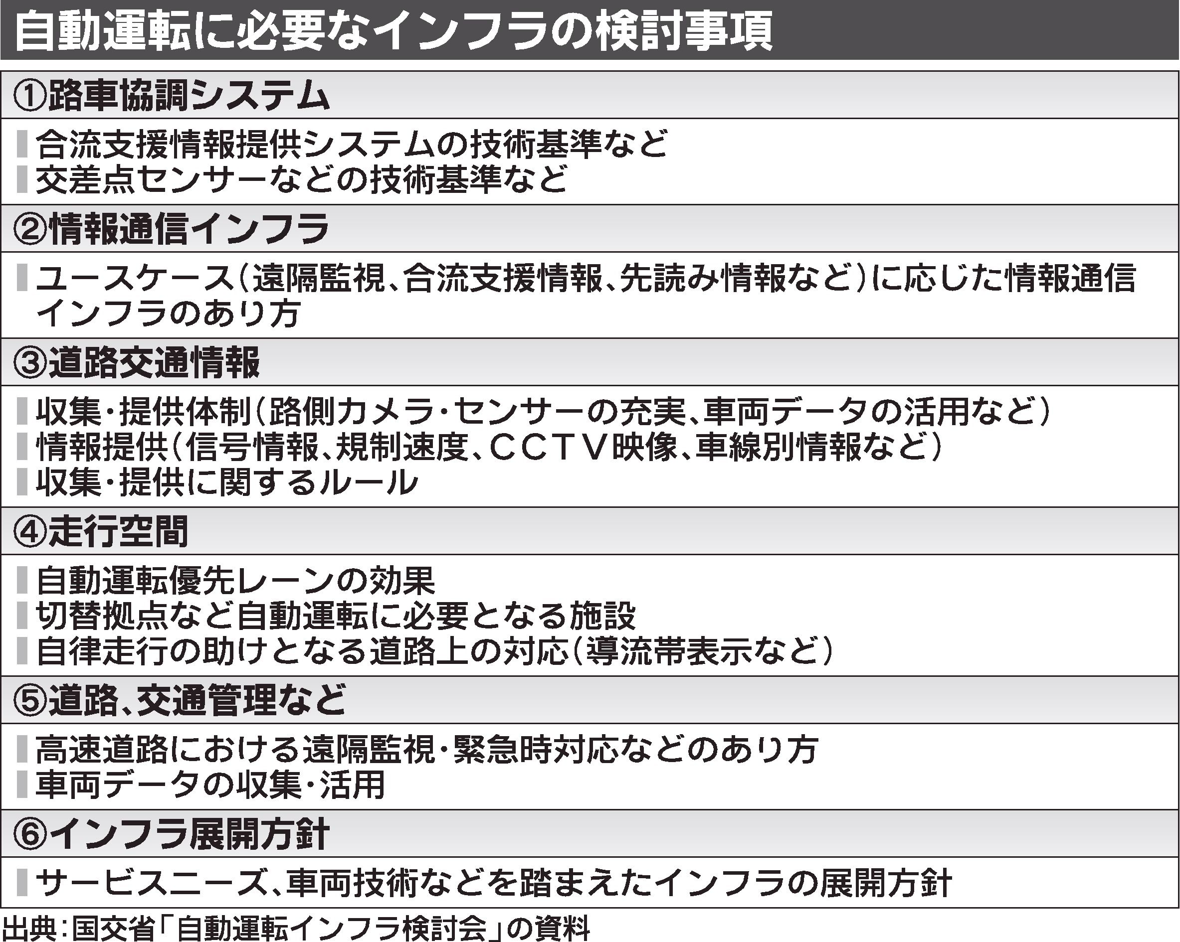 政府は、自動運転に必要な道路や情報通信といった社会インフラのあり方を考える検討会をこのほど立ち上げた。路車協調システムなどの技術基準をつくり、自動運転サービスの早期実用化につなげて物流や地域公共交通の課題解決を目指す。 「自動運転インフラ...