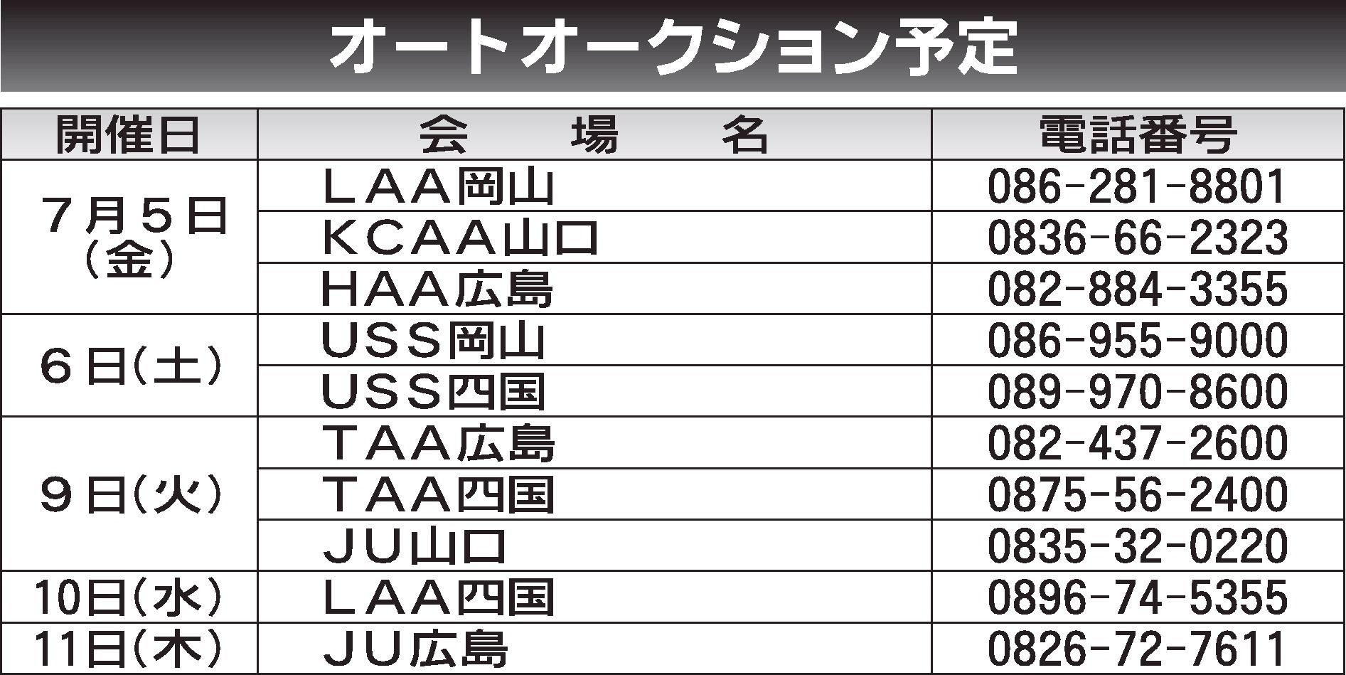 〈オートオークション予定〉中四国地区 2024/7/5~11