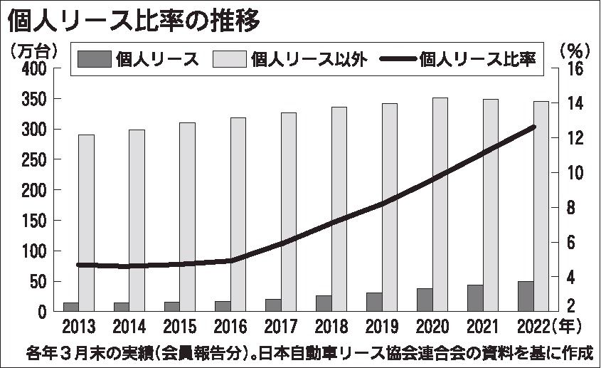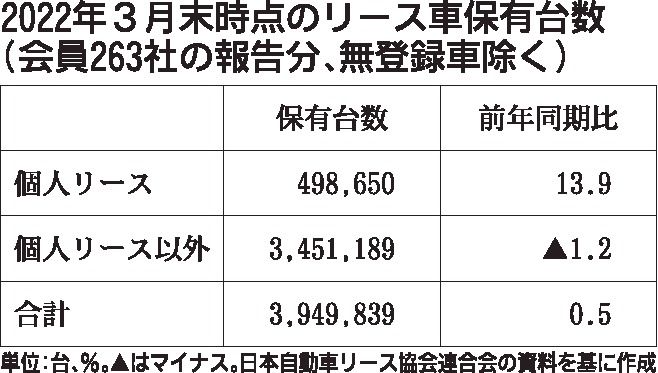 自動車リース市場で、個人リースの割合が伸長している。日本自動車リース協会連合会(JALA、上谷内祐二会長)が今月下旬までに公表した3月末時点の車種別・リース車保有台数によると、国内のリース車保有台数に占める個人リースの比率が前年比1・5㌽...