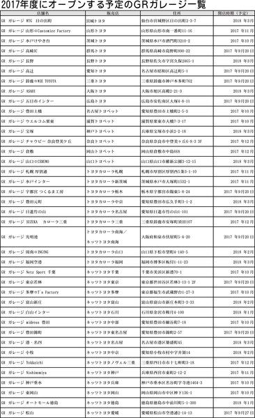 【2017年度にオープンする予定のGRガレージ一覧】