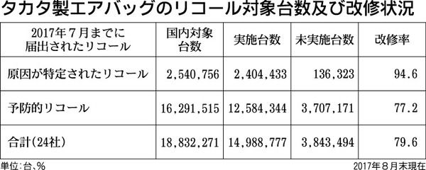国土交通省は20日、タカタ製エアバッグインフレーター(膨張装置)の改修状況を公表した。8月末時点の改修率は前月末より1・5ポイント上昇し、79・6%になった。総対象台数は延べ1883万2271台で前月末と変わらない。...