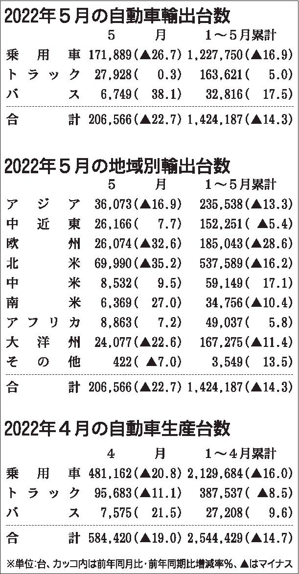 日本自動車工業会(自工会、豊田章男会長)がまとめた5月の自動車輸出台数は、前年同月比22.7%減の20万6566台で、5カ月連続でマイナスとなった。4月に比べて減少幅が拡大し、半導体不足や新型コロナウイルス感染拡大などによる部品調達難の減産影響が輸出台数に影響した格好だ。中国・上海市のロックダウン(都市封鎖)が6月で解除されたものの、自動車メーカーによっては生産調整などが行われており、依然として予断を許さない状況が続いている。