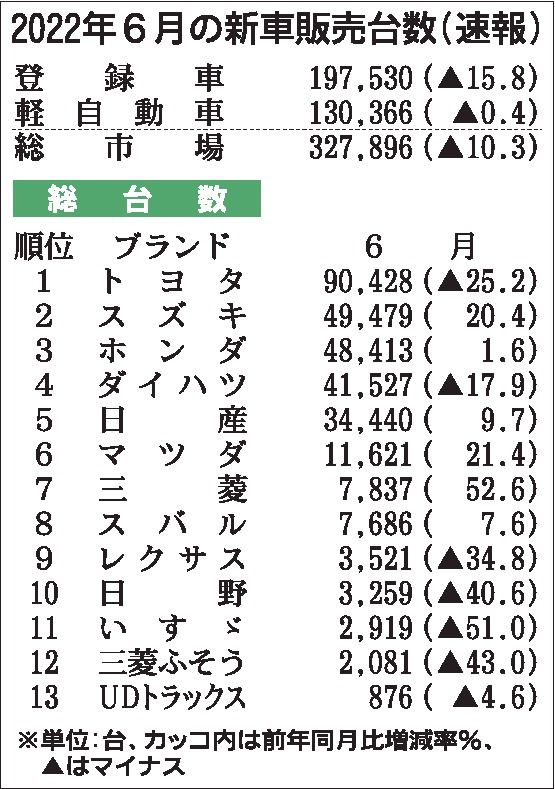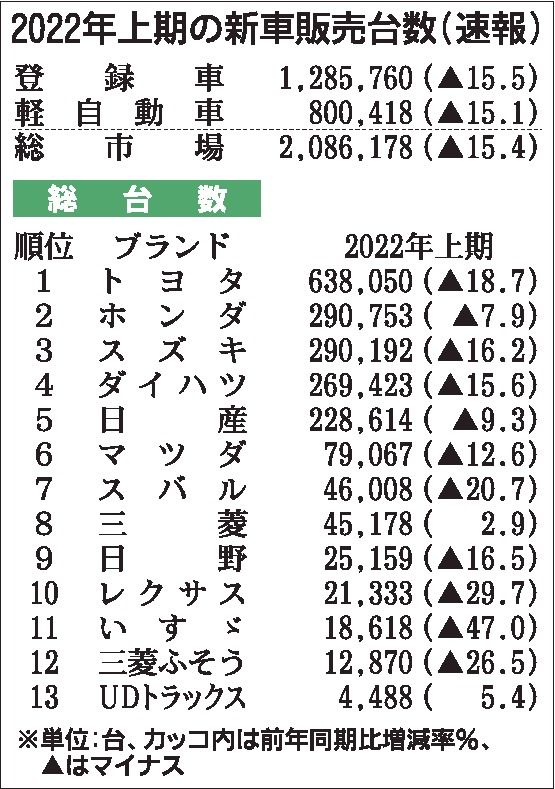 2022年上期(1~6月)の新車販売台数は、登録車と軽自動車の合計で前年同期比15・4%減の208万6178台で、2年ぶりのマイナスに転じた。登録車は同15・5%減の128万5760台で統計開始以来下から3番目、軽自動車は同15・1%減の...