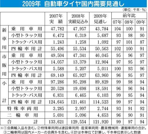 新車用・補修用ともに減少―。日本自動車タイヤ協会(JATMA、三野哲治会長)は21日、2009年の自動車タイヤ国内需要見通し(二輪、特殊車両含む)を発表した。これによると09年の自動車タイヤ需要は前年比6・0%減の1億2192万本と予測し...